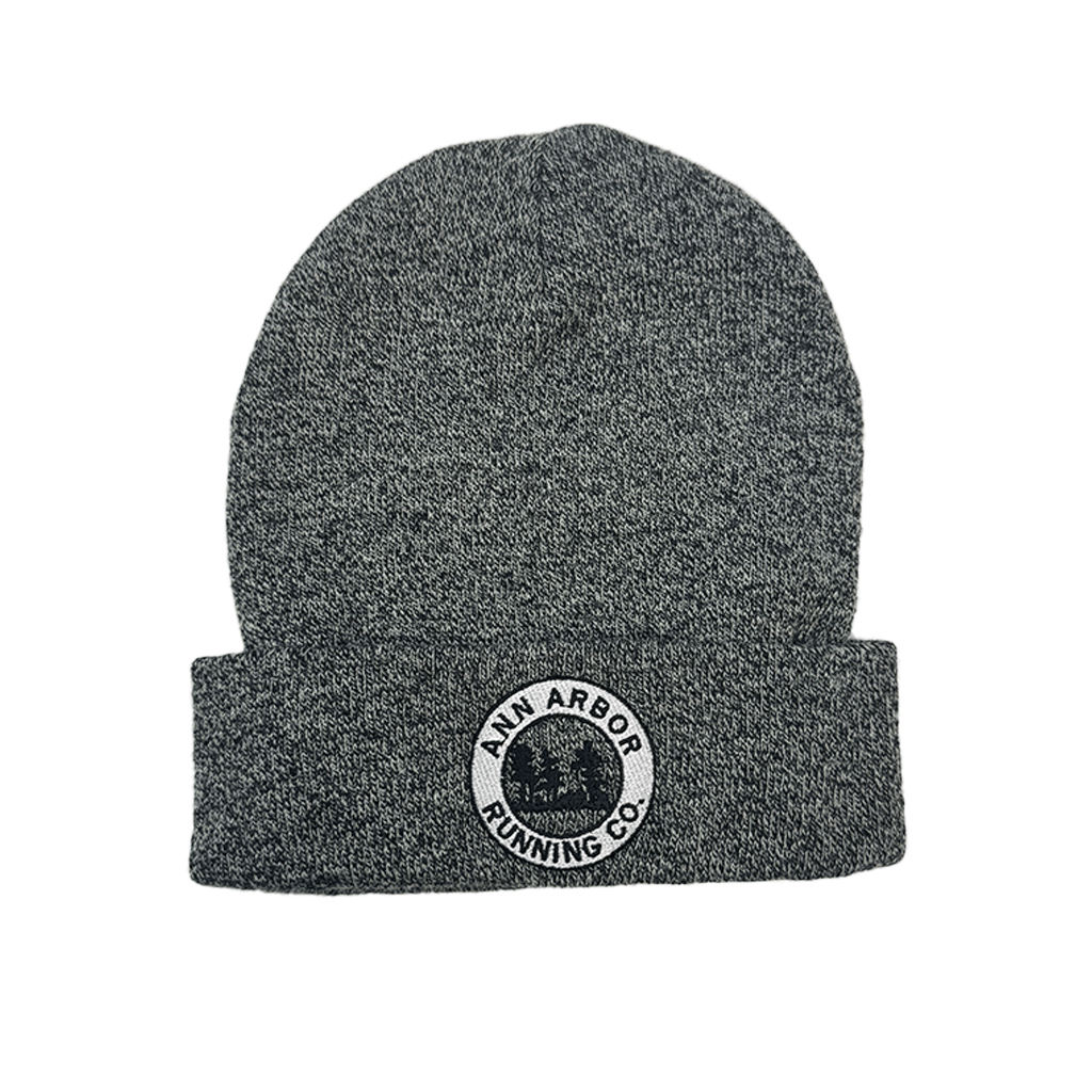 A black heather winter hat with an AARC logo on it.